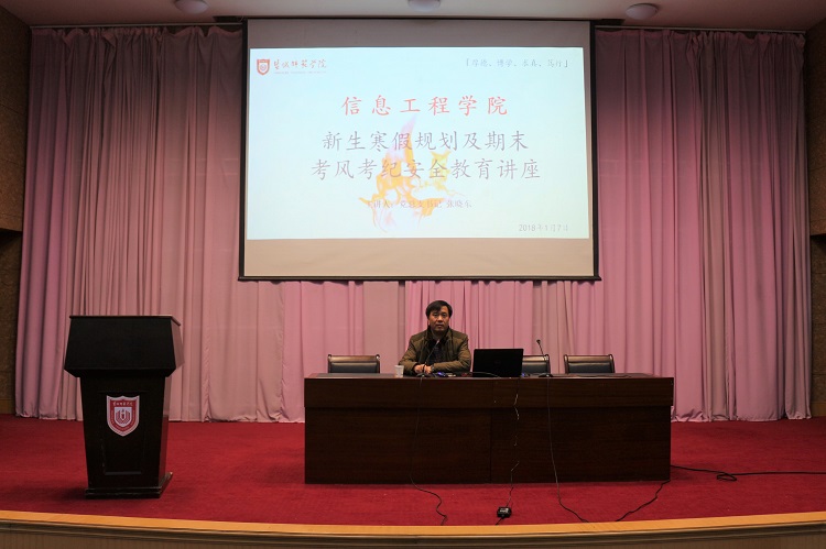 此次讲座围绕“新生寒假规划及期末考风考纪”主题展开。首先,张书记向同学们详细介绍了期末考试以及假期离校的安排,提醒同学们要提前做好复习应考的准备,及时与家人报备自己的行程,加强自身安全防范意识,与安全共行。张书记重点强调了诚信考试问题,并向同学们提出建议——为自己做一个覆盖大学四年的学业生涯规划,有的放矢,比如考研、考公、对口就业等,希望同学们能够瞄准方向,珍惜大学时光,砥砺前行,不懈奋斗。