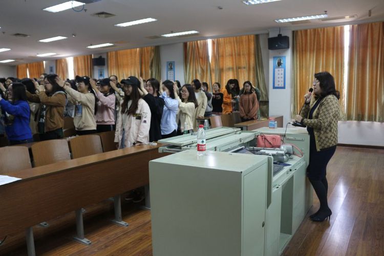 讲座伊始,李萍教授用“边唱边捶”的趣味小游戏将同学们带入活跃的气氛中,同学们以愉悦的心情融入了此次的主题讲座。此次讲座的主题是《生命之美你我共绘——女老员工生命安全心理教育讲座》,讲座分别从四个方面阐述了生命的可贵,分别是认知生命的历程、欣赏生命的可贵、尊重彼此的生命、自我心理维护。李萍教授通过PPT向同学们展示了地震、海啸、泥石流等自然灾害的照片,旨在教导同学们尊重并欣赏生命的可贵,随后李萍教授通过举例日常生活中发生的一些不良事件提醒女大学生要规避风险并提高自我安全防范意识。