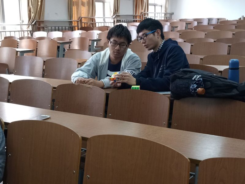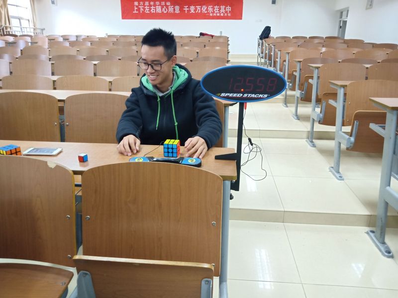 随着评委一声令下,追击赛便热火朝天地开始了。首先上场的是,杨斯为同学对战徐闯同学。面对对手,他们表现得落落大方,面对结果,他们愿赌服输。随后,赛事渐渐进入了白热化,更因为前魔方社的社长任洪壮的加入,把比赛推向了高潮。不论是二阶、四阶还是金字塔魔方,只见他手指翻飞稍稍几下便将魔方归位。给观众带来了不同凡响的震撼的感觉,整场比赛让人热血沸腾,不禁拍手叫好。接着,负责人李彦霖开始了对新人的指导,面对新人,他极其耐心的讲解教学让他们逐步挑战自己,从开始的13秒复原到最后的8秒复原,成员的每一秒进步都是质的飞跃。