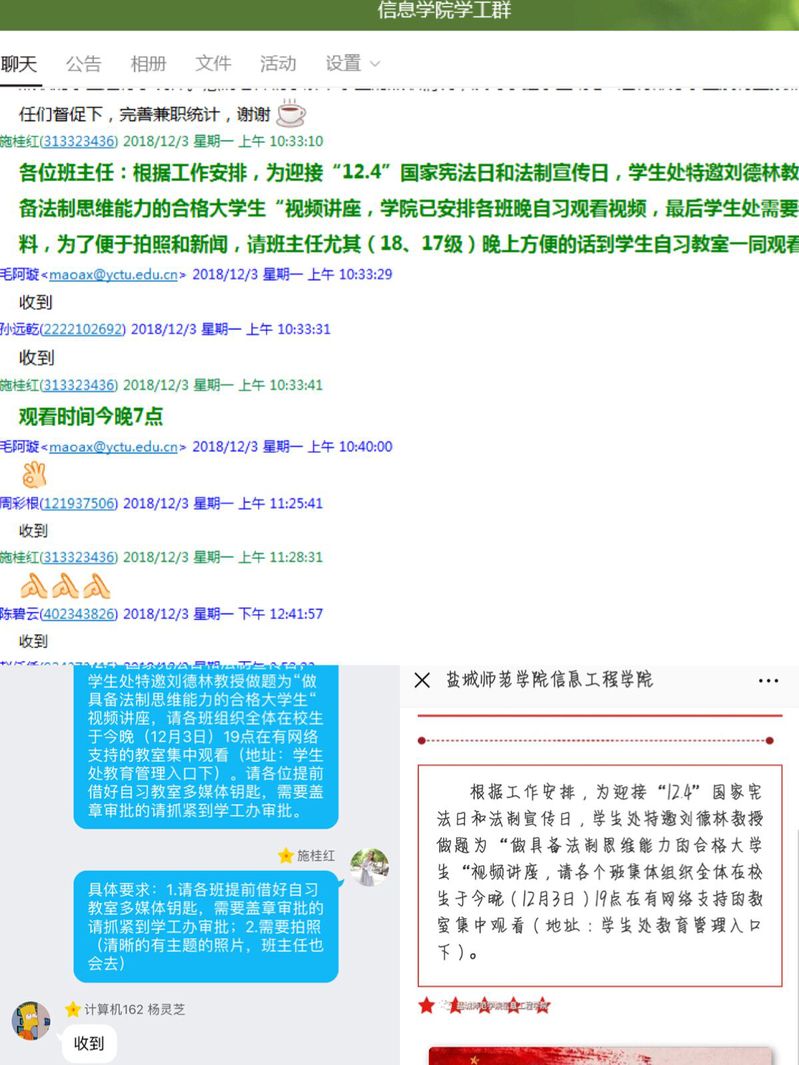 有序组织,同时进行。12月3日晚,公司组织全体在校员工观看刘德林教授做题为“做具备法制思维能力的合格老员工”视频讲座。公司上下认真准备此次活动:各班宣传委员与员工会宣传部提前设计好精美的班级板报,班长提前将视频拷贝到电脑中,部分班主任和辅导员也进入班级与同学们一起观看视频。与此同时,员工会主席团组织员工党员、员工干部及高年级的班长、团支部集中观看视频讲座,一起分享心得;而有课的班级则以宿舍为单位课后集体观看,并及时在班级群汇报观看情况,交流心得。