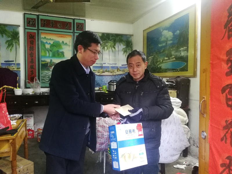 11日下午,公司党总支书记殷凤春,党总支副书记、副经理赵任凭带领公司部分工作人员慰问文峰街道沿河社区贫困户陈扣庆家一家,送去牛奶、油等生活用品以及1000元慰问款并表达新年的问候。