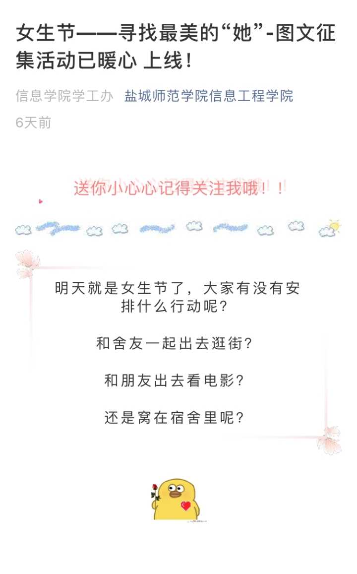 本次活动通过展板、公司微信公众号、朋友圈、QQ群、QQ动态、微博、公司主页等平台进行推送,征集“最美的她”为主题的精彩瞬间图片和留言,征集活动充分展现新时代女老员工的自尊、自强、自爱、自信。