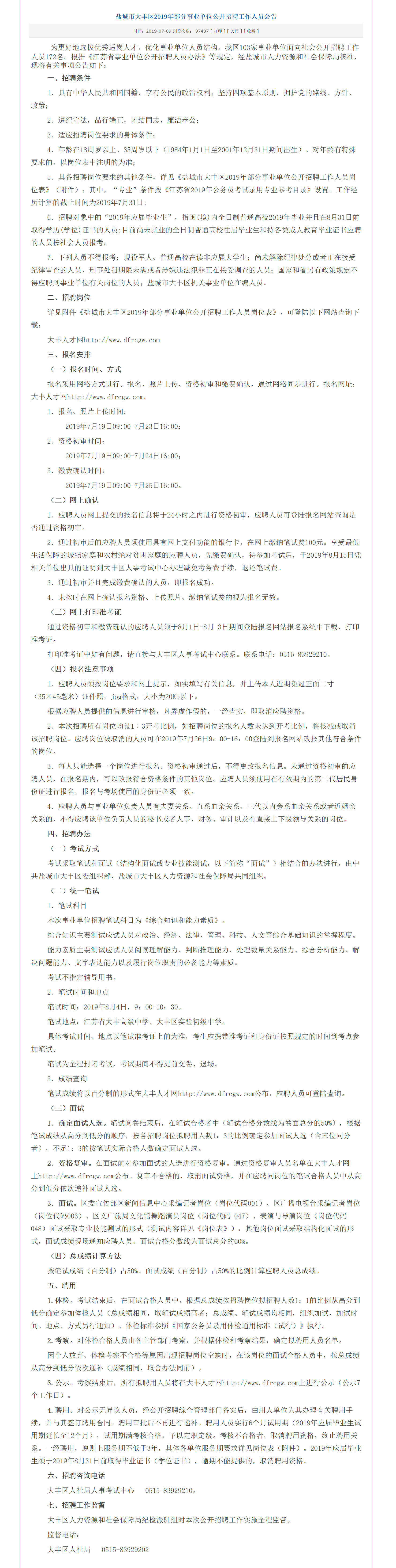 盐城市大丰区2019年部分事业单位公开招聘工作人员公告
