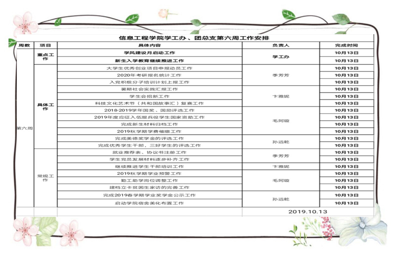 云顶国际yd222线路检测中心学工办、团总支第六周工作安排
