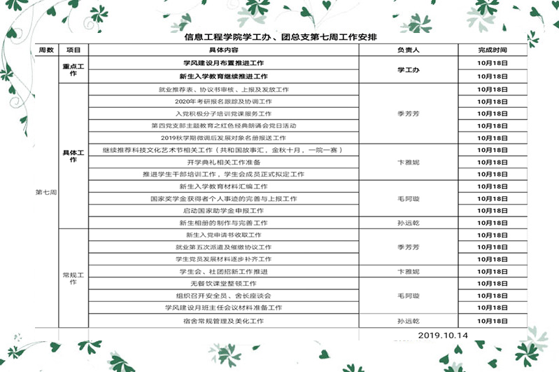 云顶国际yd222线路检测中心学工办、团总支第七周工作安排
