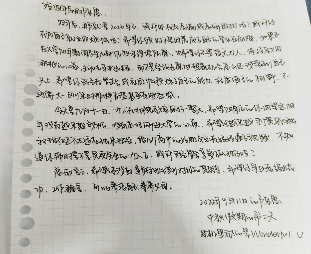 软工22(3)班匡诗逸同学说:“我觉得给未来的自己写信是一件很有意义的事情,未来收到时的惊喜,打开信时的忐忑,阅读后的感动与感慨是我们的最美好的礼物。让我们一起朝着梦想,劈波斩浪,奋楫扬帆,为实现鸿鹄之志不断奋斗,书写最美青春诗篇。”