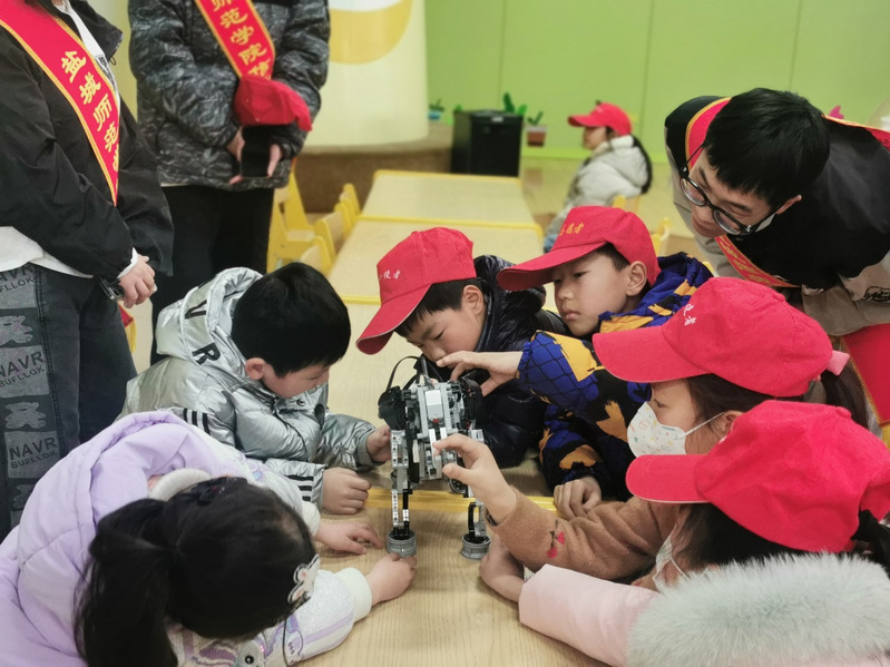 云顶国际yd222线路检测中心科技宣讲团成员唐元哲为小朋友们做机器人知识科普宣讲。唐元哲以机器人动画视频为引子,把小朋友们带入科技世界,他围绕“机器人的起源、机器人的发展历程和机器人的开发应用”问题,与小朋友亲密互动,有问有答,现场氛围活跃。小朋友们对现场展示的仿生大象机器人、智障巡检机器人、智慧交通控制器等非常感兴趣,在志愿者的协助下,争相按下遥控器,控制机器人的行走和动作,感受着科技的魅力。