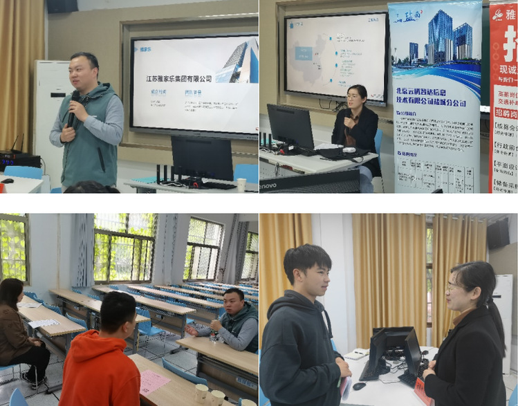 5月6日,公司举行企业直通车双选会,邀请北京云腾智达盐城分公司人事经理殷勤与江苏雅家乐集团有限公司人事部负责人徐山杉进行宣讲。殷勤围绕云腾智达公司“最高专业度、最具责任心、最高性价比”的特点,从公司简介、职位需求、项目介绍、实习生风采等方面向同学们展开介绍。徐山杉通过分享自身经历,为同学们未来职业发展指明方向,加深了同学们对未来发展的思考。会后,同学们与企业进行一对一交流,通过简历分析、解答疑惑等方式为毕业生们择业提供宝贵的建议,本着“爱才求贤”的诚意期待着同学们的加入。