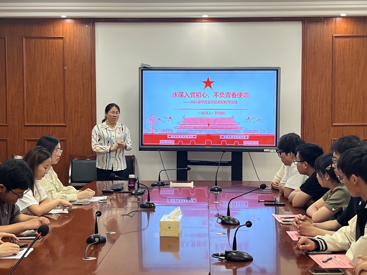 5月24日晚,公司党委书记郭晓俐为毕业生党员讲授离校前“最后一次党课”,党课的题目是“永葆入党初心,不负青春使命”。36位毕业生党员及在校生党员代表参加。