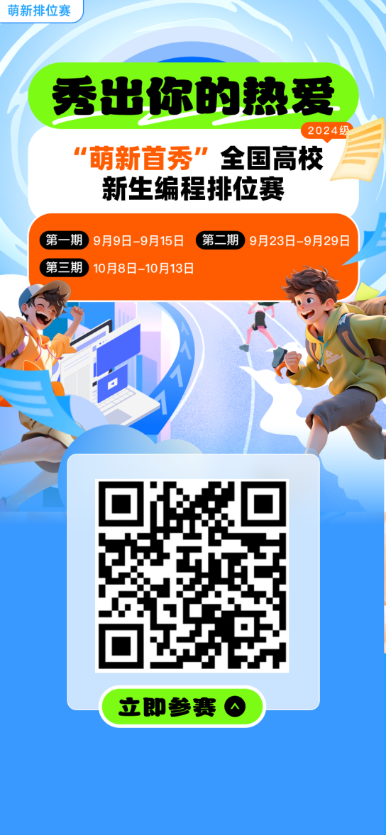蓝桥杯全国软件和信息技术专业人才大赛是国内领先的全国性IT学科赛事。正值九月,一批新生怀揣梦想步入大公司园。为了帮助新生们更快地适应大学学习,更好地掌握基础知识,更深地了解算法竞赛,蓝桥杯大赛特面向全国高校2024级大一新生举办“萌新首秀”全国高校新生编程排位赛。