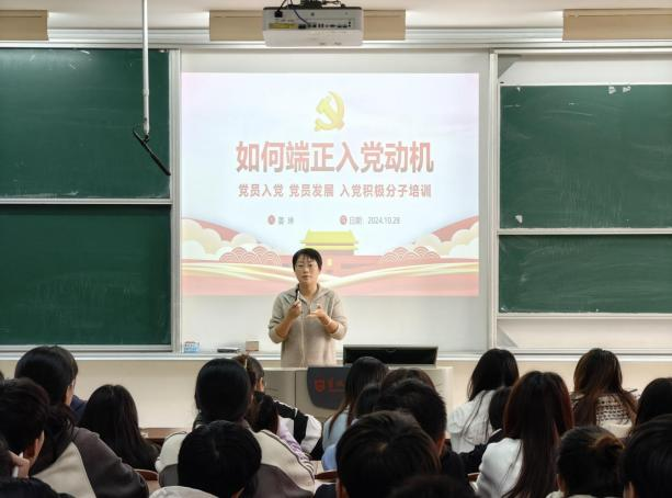 课上,姜琳强调了正确的入党动机应该来自于政治认同、思想认同、理论认同、情感认同,端正入党动机尤为重要。姜琳从“中国共产党的三大历史贡献”“对党的认识”“党员的权利和义务”“树立正确的入党动机”“如何以实际行动争取早日入党”这五个方面依次进行讲解,指出中国共产党的根本宗旨是为人民服务,同学们要从内心挖掘自身入党的动力机制,时刻将党的根本宗旨内化于心,外化于行。