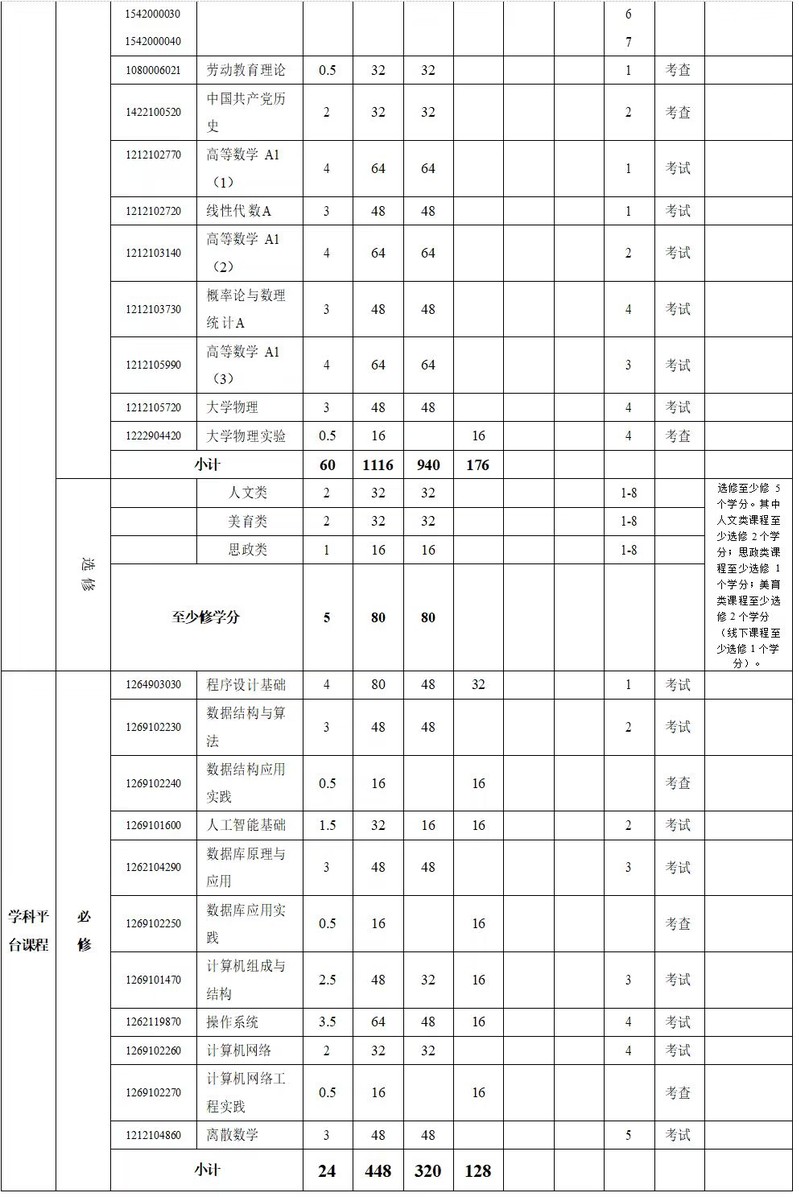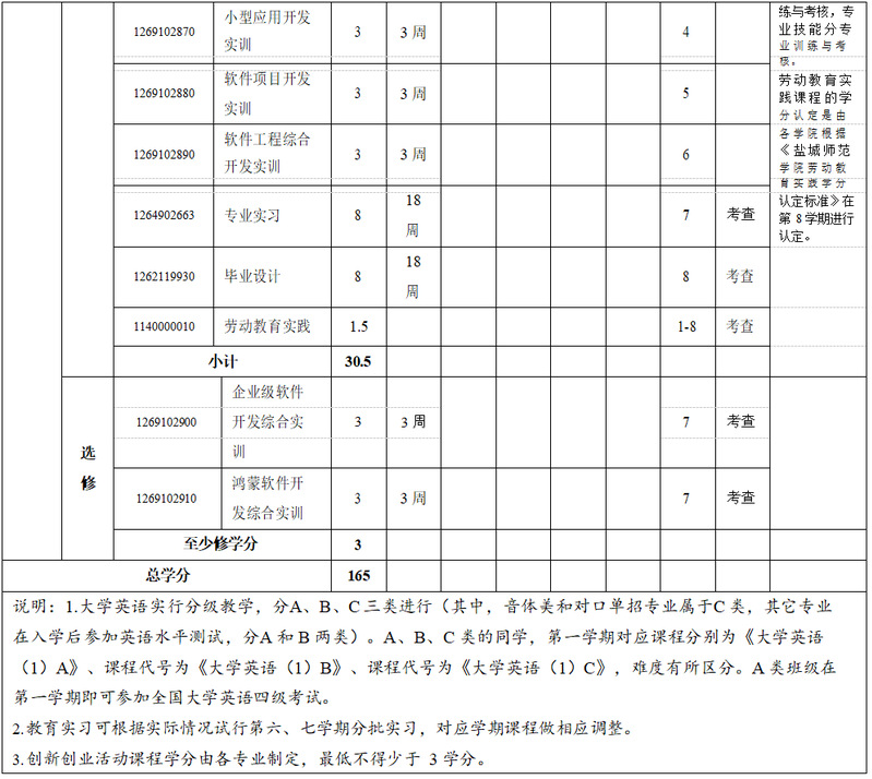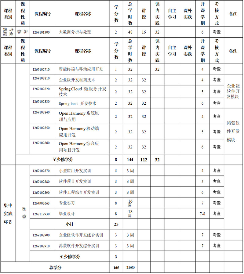主要实践环节:数据结构应用实践、数据库应用实践、面向对象应用开发、小型应用开发实训、企业级软件开发综合实训、鸿蒙软件开发综合实训、专业实习、毕业论文(设计)等。