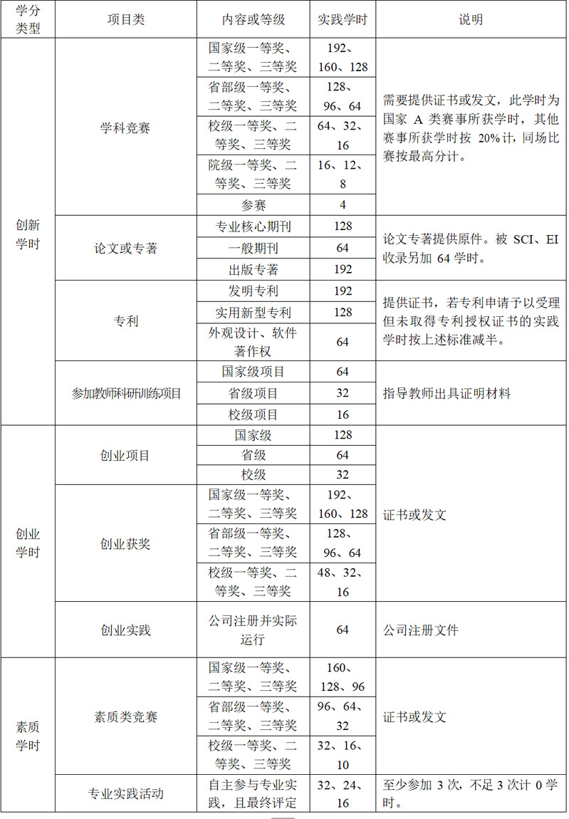 4. 国际级竞赛获奖不低于国家级同等级奖项;如竞赛项目设有特等奖,则学分为同等级一等奖学时增加