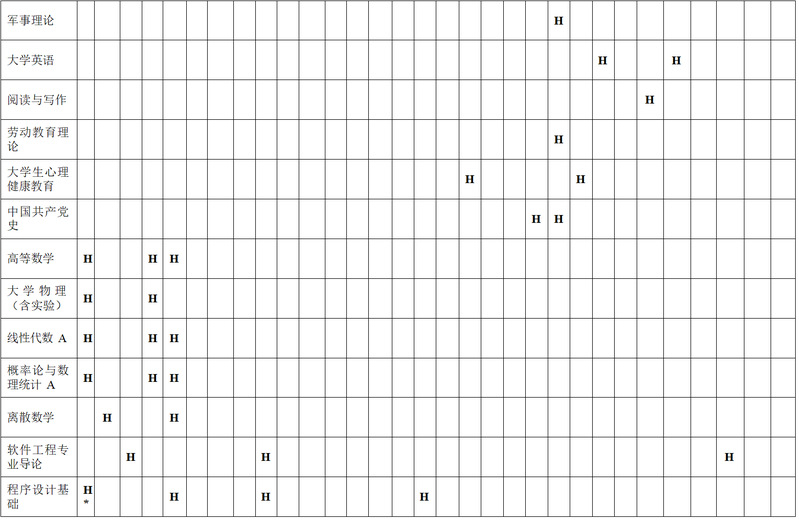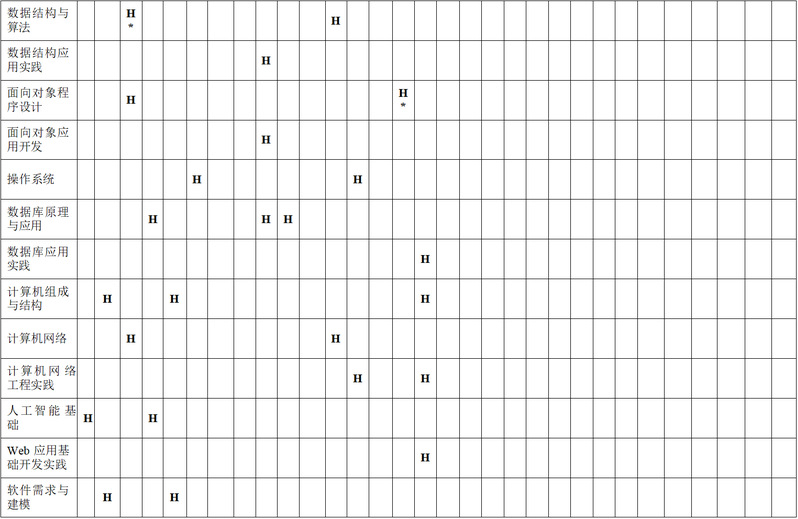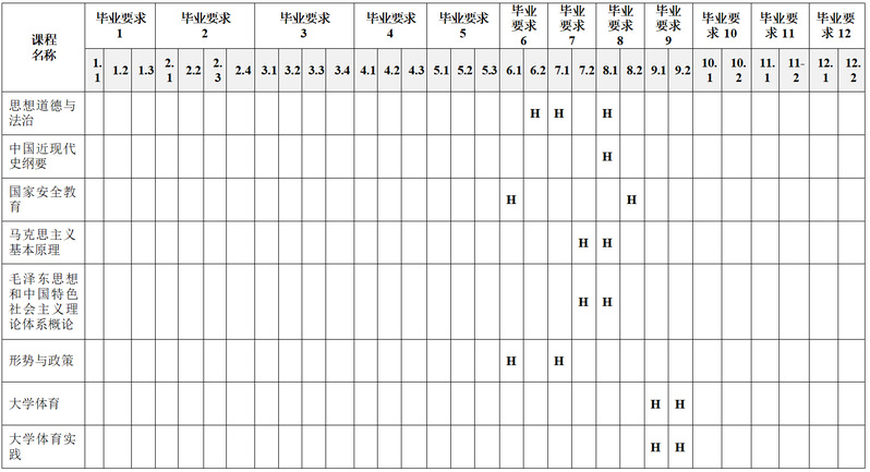 说明:H表示该门课程对该毕业要求支撑度高,H*标记课程为与每项毕业要求达成关联度最高的课程。
