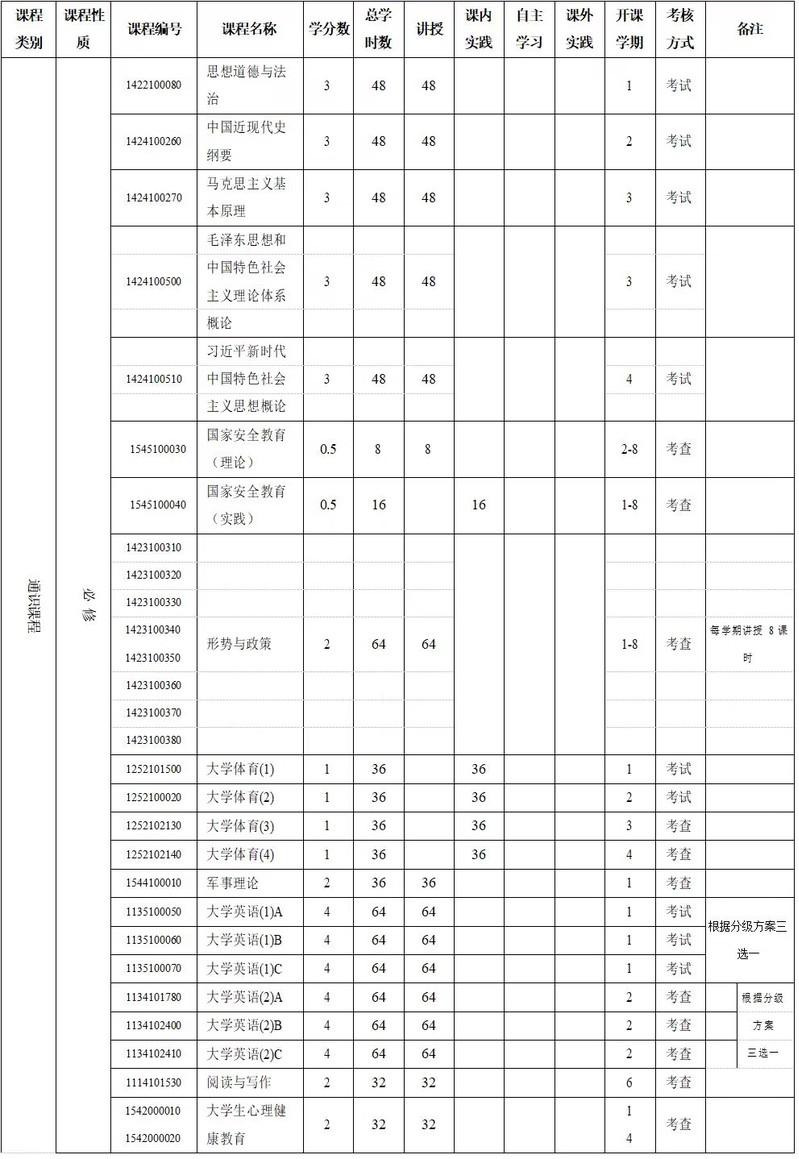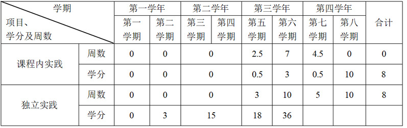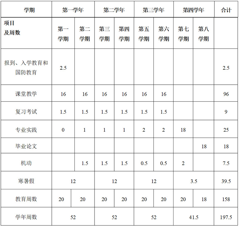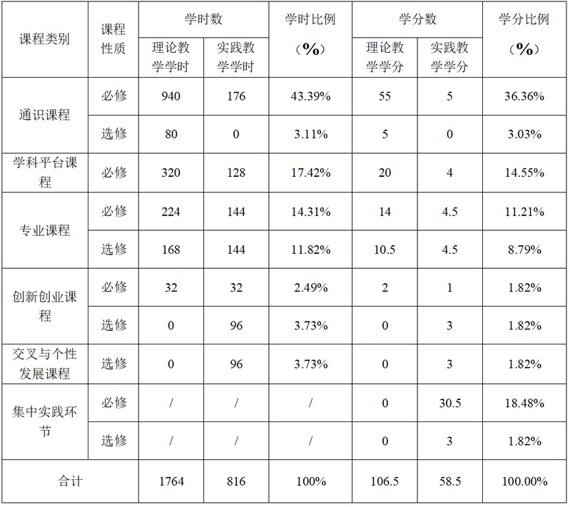 其中:理论教学1764 学时、106.5 学分,分别占总学时64.55%、占总学分61.21%,实践教学816 学时、58.5学分,分别占总学时31.63%、占总学分35.45%。