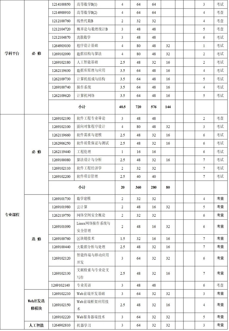 程序设计基础、数据结构与算法、数据库原理与应用、操作系统、计算机网络、软件需求与建模、算法设计与分析、软件质量保证与测试、软件项目管理。