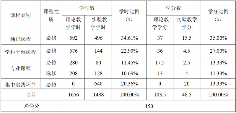 其中:理论教学1656学时、103.5学分,实验教学1488学时、46.5学分,分别占总学时52.67%、47.33%,占总学分69.00%、31.00%。