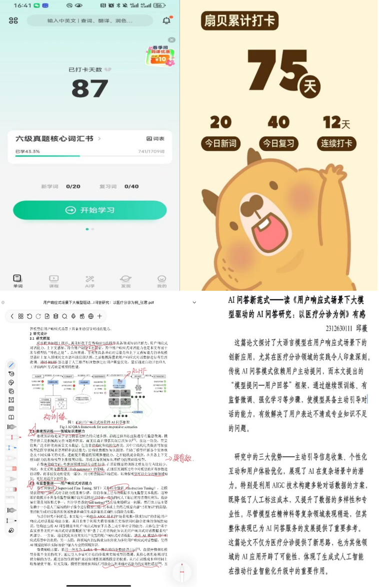 21天学习打卡,深植勤学理念。自集团“21天学习打卡活动”开展以来,计算机231“王强班”迅速响应,精心策划了“代码铸就梦想、四六级英语单词背诵、专业书籍研读、文献资料分享”四个打卡主题,同学们每日按时在“今日校园”平台上打卡,踊跃参与、相互督促,营造出浓厚的比学赶超氛围。学习打卡活动助力同学们养成优良学习习惯,提升了专业素养和学习能力,增强了班级的学习向心力。