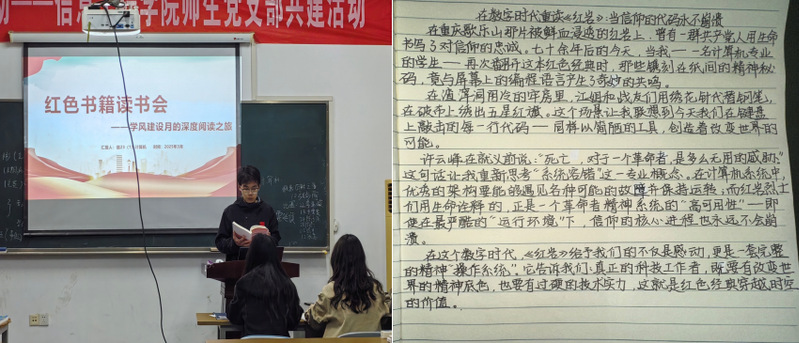 红色经典阅读,激发学习动力。4月3日晚上,计算机231“王强班”在公司楼221教室举办红色经典读书会。活动中,班长李亚峻领读《共产党宣言》,集体诵读《红岩》《红星照耀中国》等经典片段;同学们积极发言,交流读书心得,探讨对当下生活与未来规划的思考,现场气氛热烈。此次读书会有效加强了同学们理想信念教育,提升了学习自觉性,为推动王强班创建注入强劲动力。