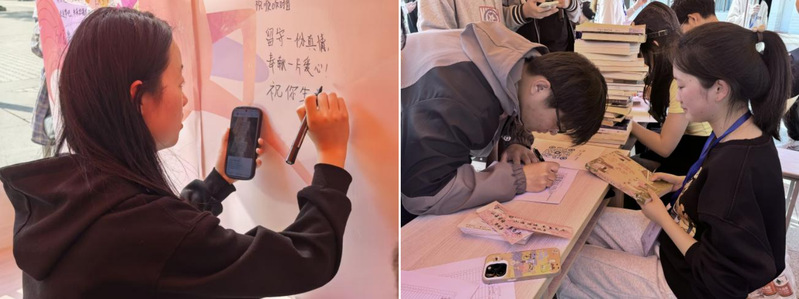 “公益+互动”线下体验活动,设置三大特色板块。图书捐赠区,学子们捐献珍藏书籍并亲笔题写寄语,让知识在传递中焕发新生;“321看这边”趣味游戏区,通过默契挑战深化团队协作,将阅读乐趣转化为实践体验;“山海同语”心愿墙则承载百余条温情寄语,笔墨间流淌着书香温情,传递着人文关怀。