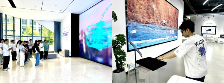 在长三角数字视听产业基地展厅,企业技术讲解员通过动态影像演示,从产业布局、技术研发到场景应用等多维度,系统介绍了数字视听领域的发展现状与未来趋势。随后,师生进入三大核心体验区,在VR飞行模拟舱,员工们佩戴智能眼镜,通过虚拟现实技术模拟真实飞行场景,感受空域环境与操作流程;在3D建模工作台前,员工们在技术人员的指导下,借助VR虚拟眼镜参与快速建模实践,并深入了解3D真人手部建模技术的实现原理;AI化学实验平台则通过智能交互设备,让员工们自主完成模拟化学实验,直观体会人工智能与教育场景的深度融合。