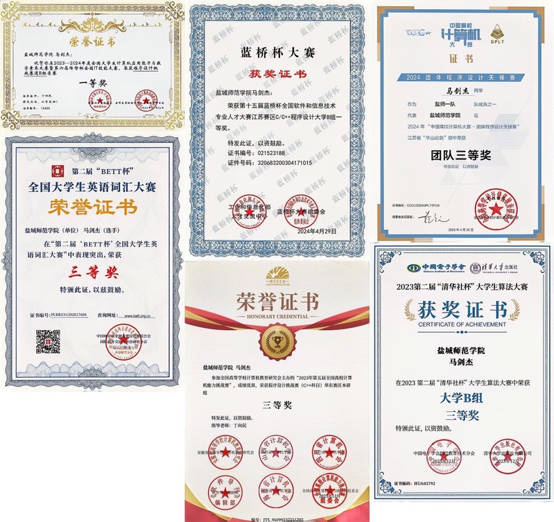 行动是青春最响亮的语言。在马剑杰看来,真正的成长不在于豪言壮语,而在于脚踏实地的坚持。他始终相信,优秀不是偶然的结果,而是日复一日积累的必然。白天的教室里总有他专注听讲的身影,深夜的自习室常亮着他奋笔疾书的台灯。这份持之以恒的耕耘,让他的学业成绩和综合测评始终名列前茅。“知行合一”是他的座右铭,在专业排名稳居上游的同时,他积极参加各类专业竞赛提升实践能力。在老师的指导和自身的努力下,他先后获得国家级奖项两项,省级奖项六项。