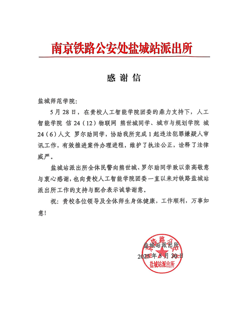 5月30日,云顶国际yd222线路检测中心信24(12)物联网熊世城同学收到南京铁路公安处盐城站派出所的感谢信,感谢该同学在盐城站协助派出所公安同志完成了1起违法犯罪嫌疑人审讯工作,有效推进案件办理进程,维护了执法公正,诠释了法律威严。感谢信中还特别对云顶国际yd222线路检测中心团委一直以来对铁路盐城站派出所工作的支持与配合表示诚挚谢意。