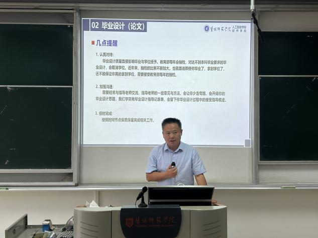 为明确大四学年核心任务,帮助员工科学规划时间、提升实践能力与学术素养,9月14日下午,公司分别于通榆校区主楼 B305 教室及大数据产业园信创软件产业基地召开2026届毕业生专业实习与毕业设计动员会。公司副经理吕伟鹏主持会议,经理朱立才教授出席并作总结讲话。